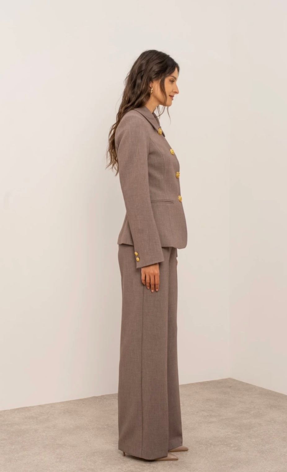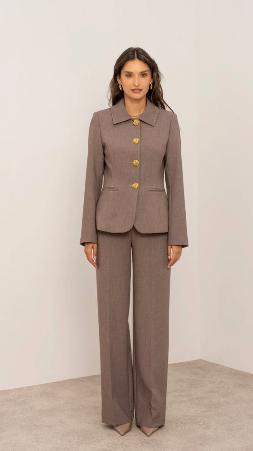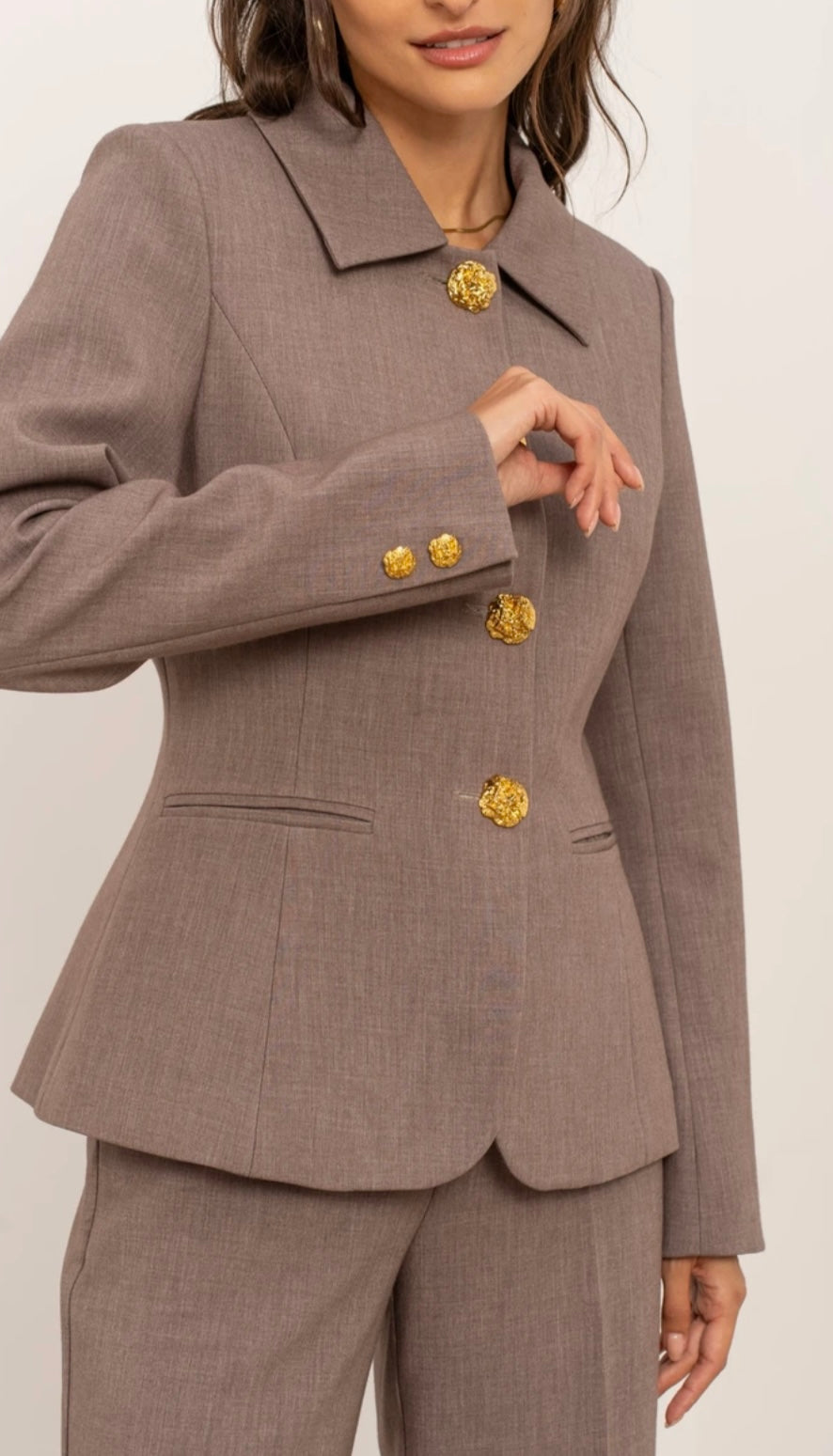 Tailored jacket. Structured shirt collar. Gold embossed jewel-style buttons. Discreet pockets. Elegant and feminine line. Classic refinement with bold charm.