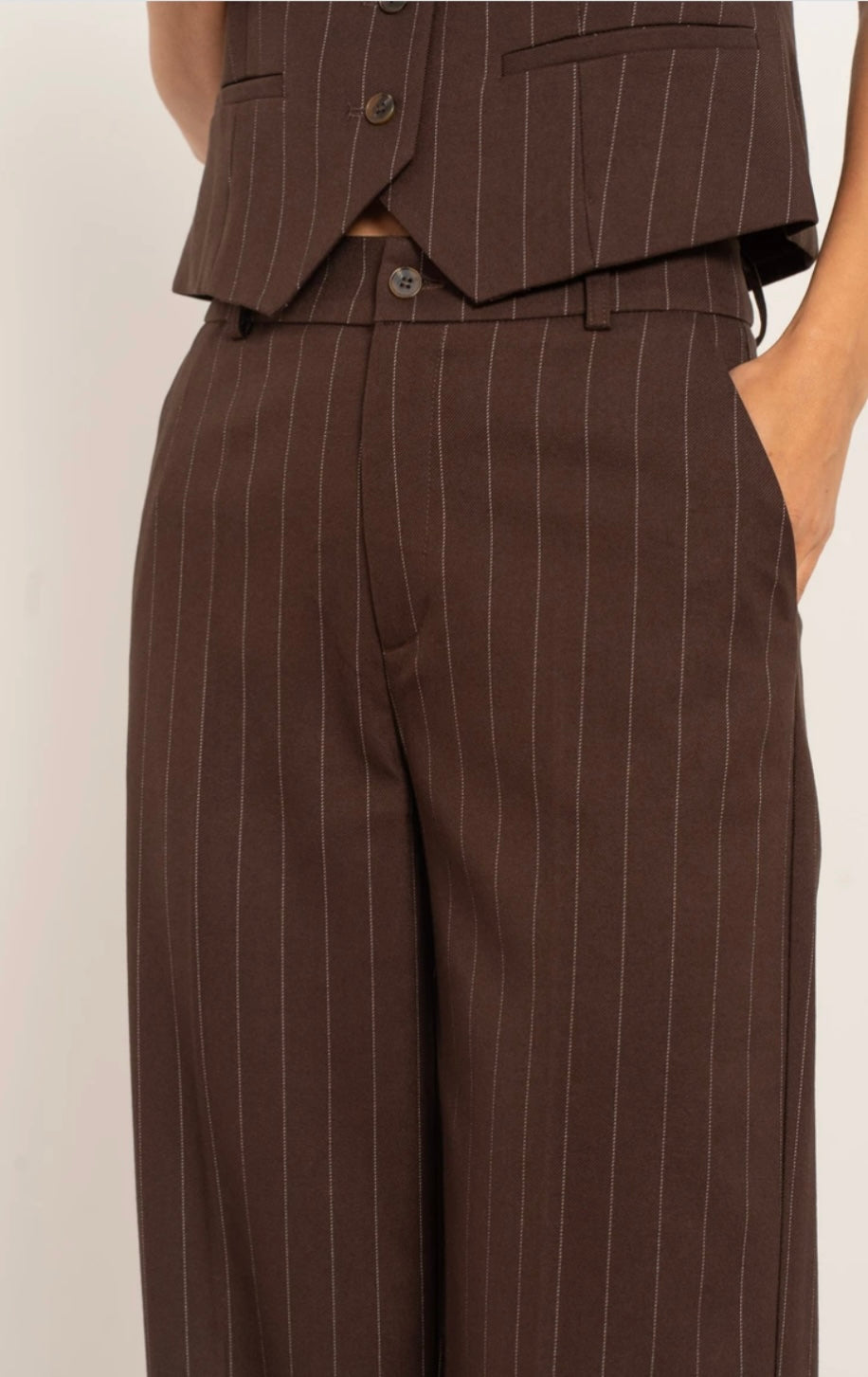Pinstripe tailored trousers. Straight and fluid cut, high waist with classic closure. Italian pockets at the front and discreet pockets at the back for a refined finish. An elegant piece to wear as a set or mix and match.