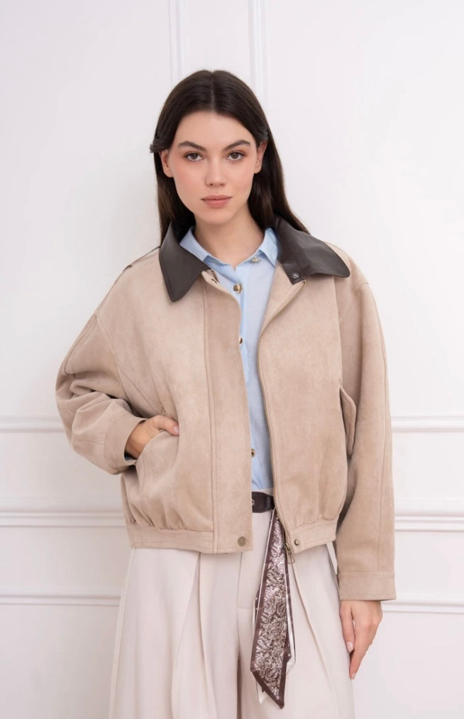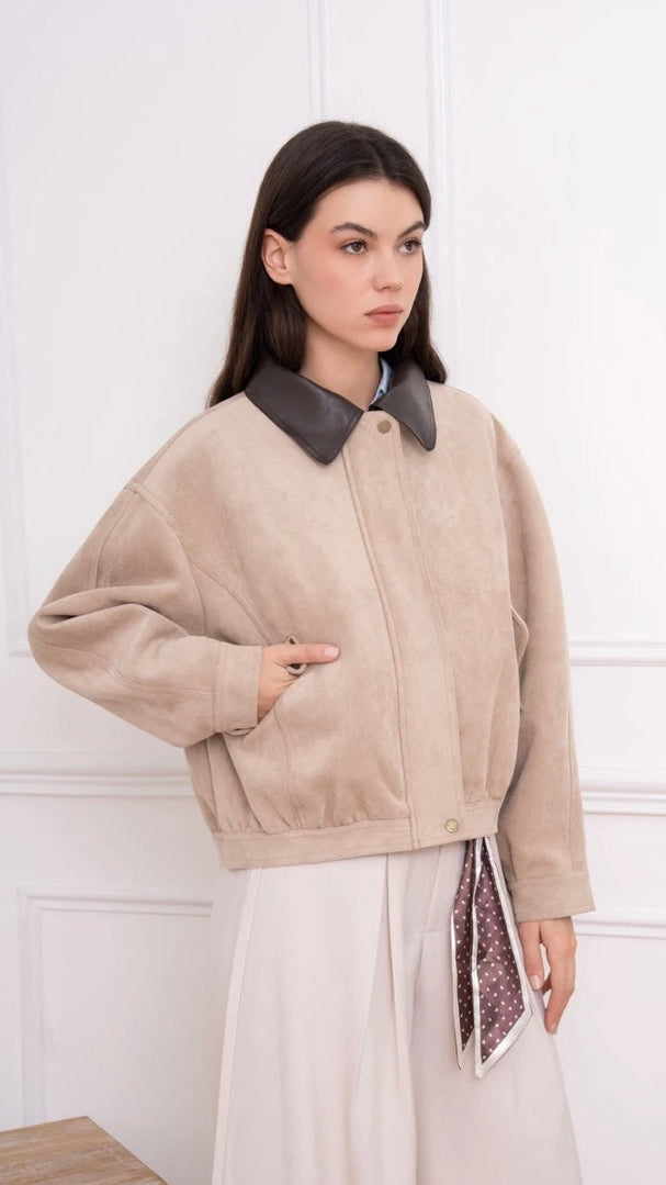 Short jacket with a modern and neat style, made in a suede effect material offering a soft touch and an elegant finish.